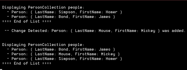 Now we add our second program that utilizes the new “enhanced” PersonCollection. Will we need to make any changes to the first program now that our library is updated? We run the first program as is with no changes and get: